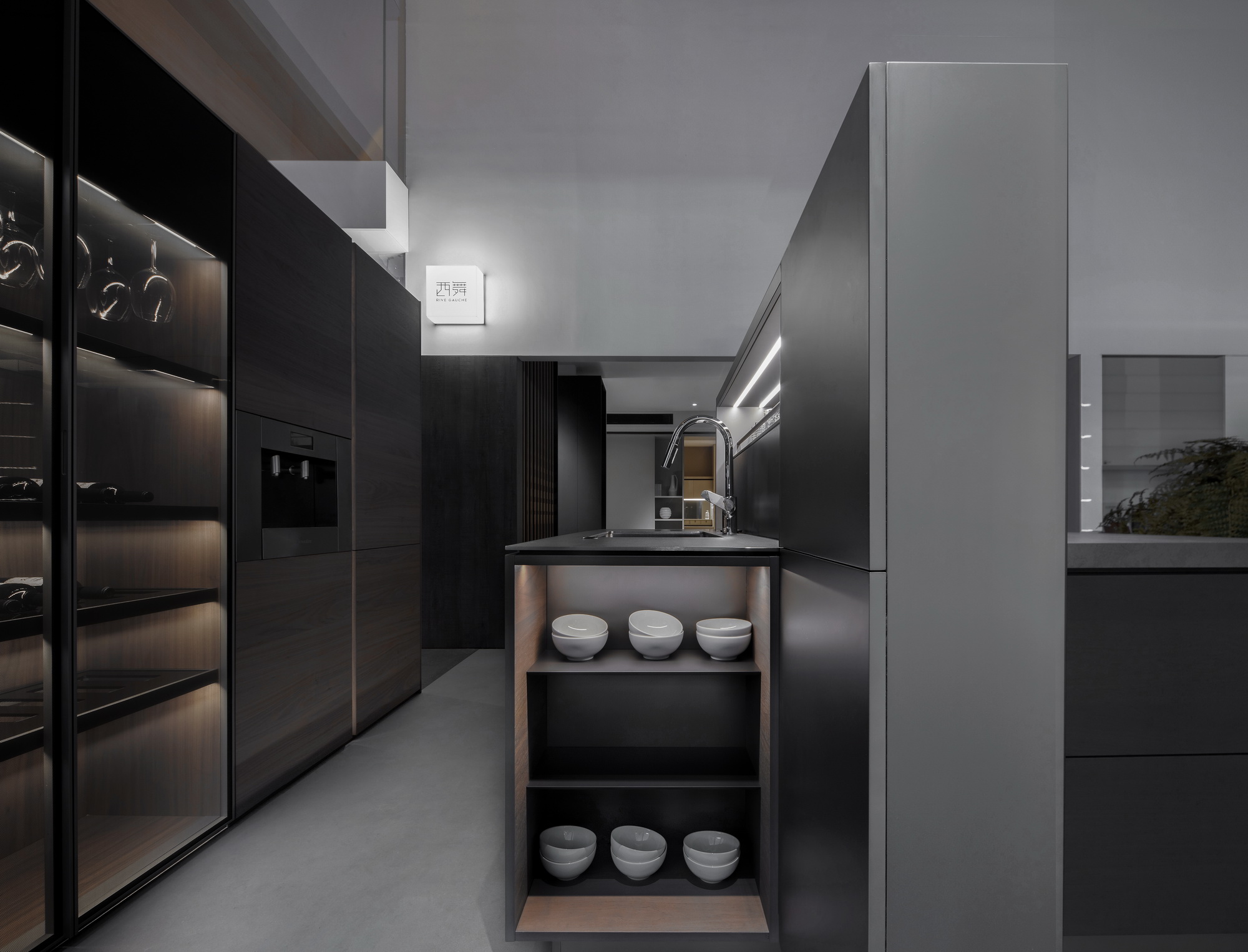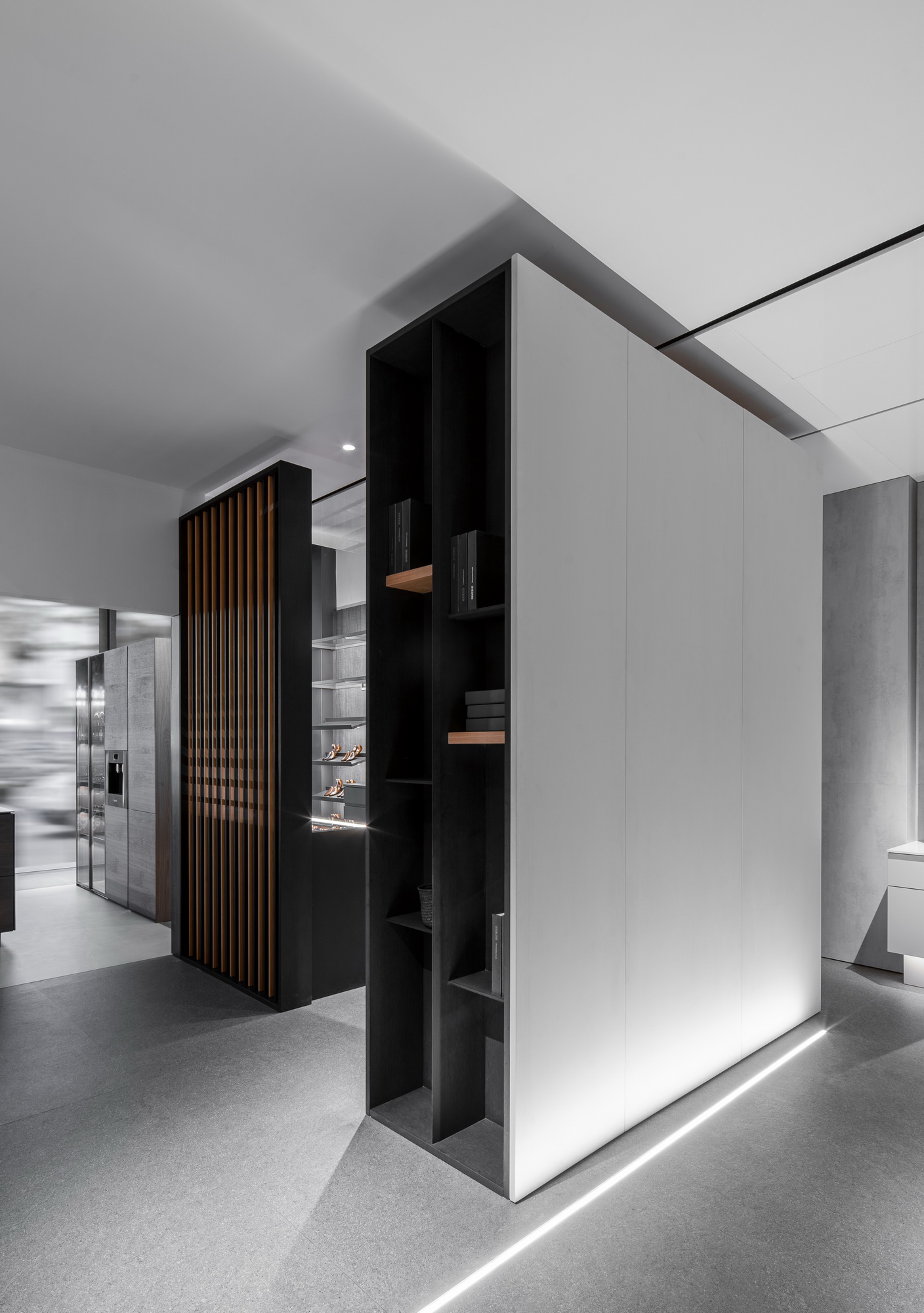 在西厨、吧台、卧室、客厅等场域连贯中单纯依靠物的载体变化产生结构性装饰和灯光的灵动赋予空间美感时。无可复减的空间形态除了结构性