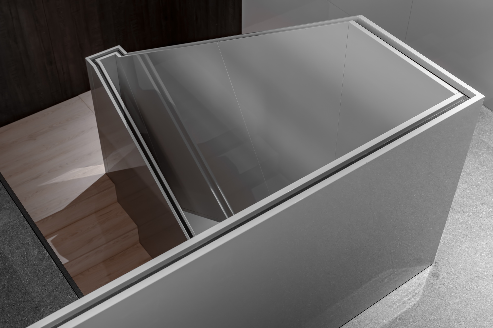等线切割亮光涂饰的方块,体块组合间错落的谋求对建筑关系的理性向往。俯仰之间,便将立体元素从一个平面中破坏分离开来,